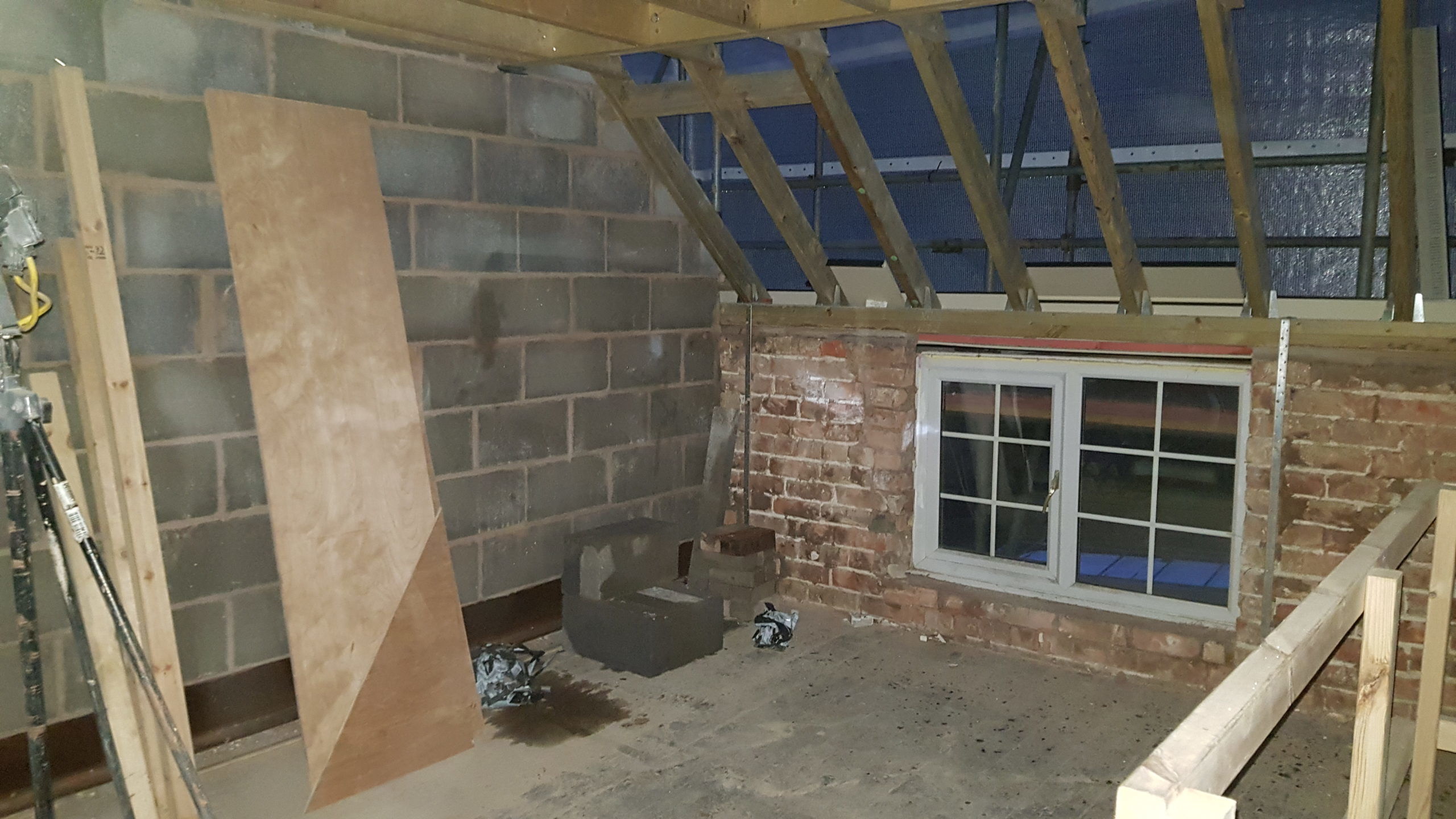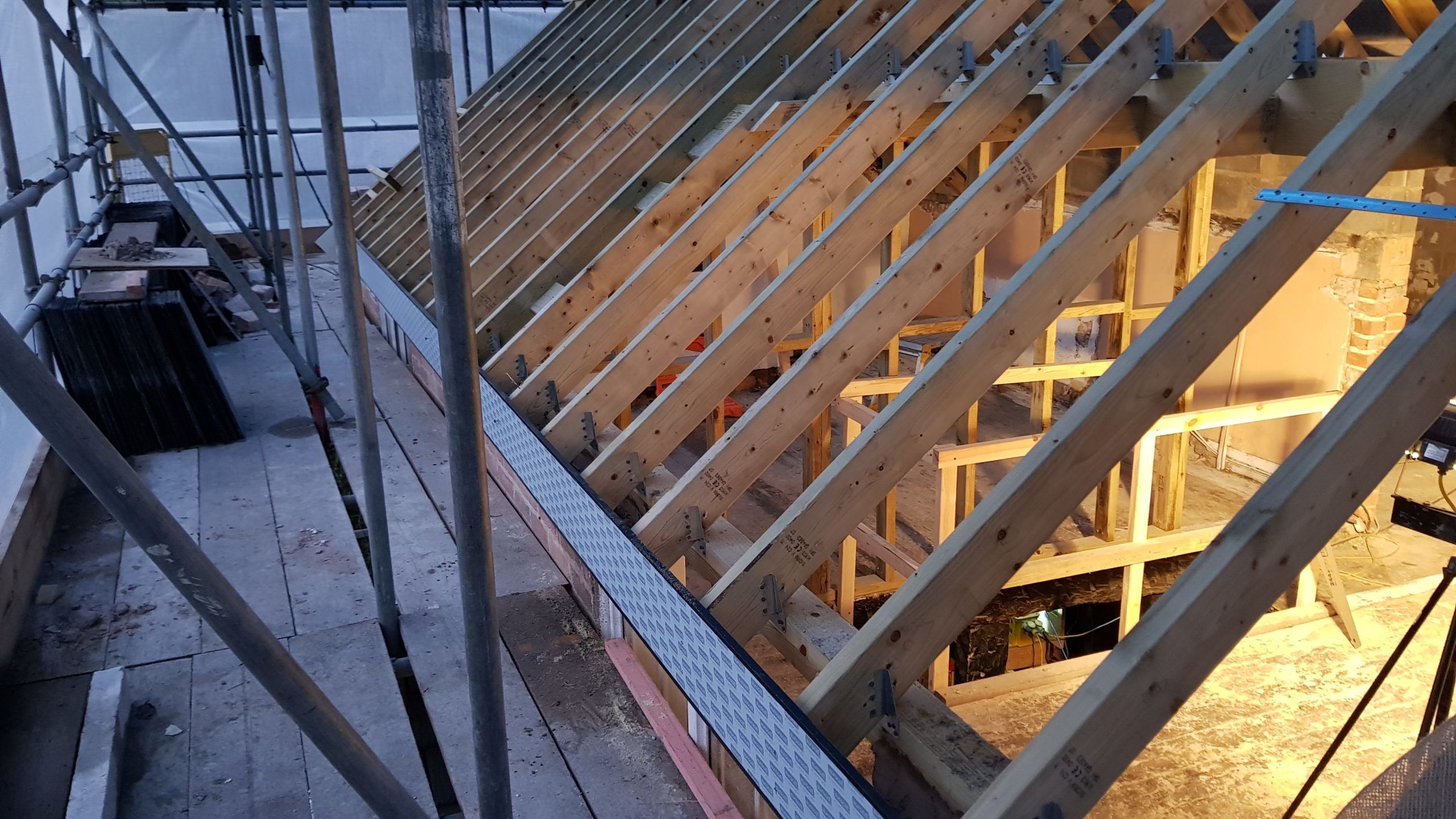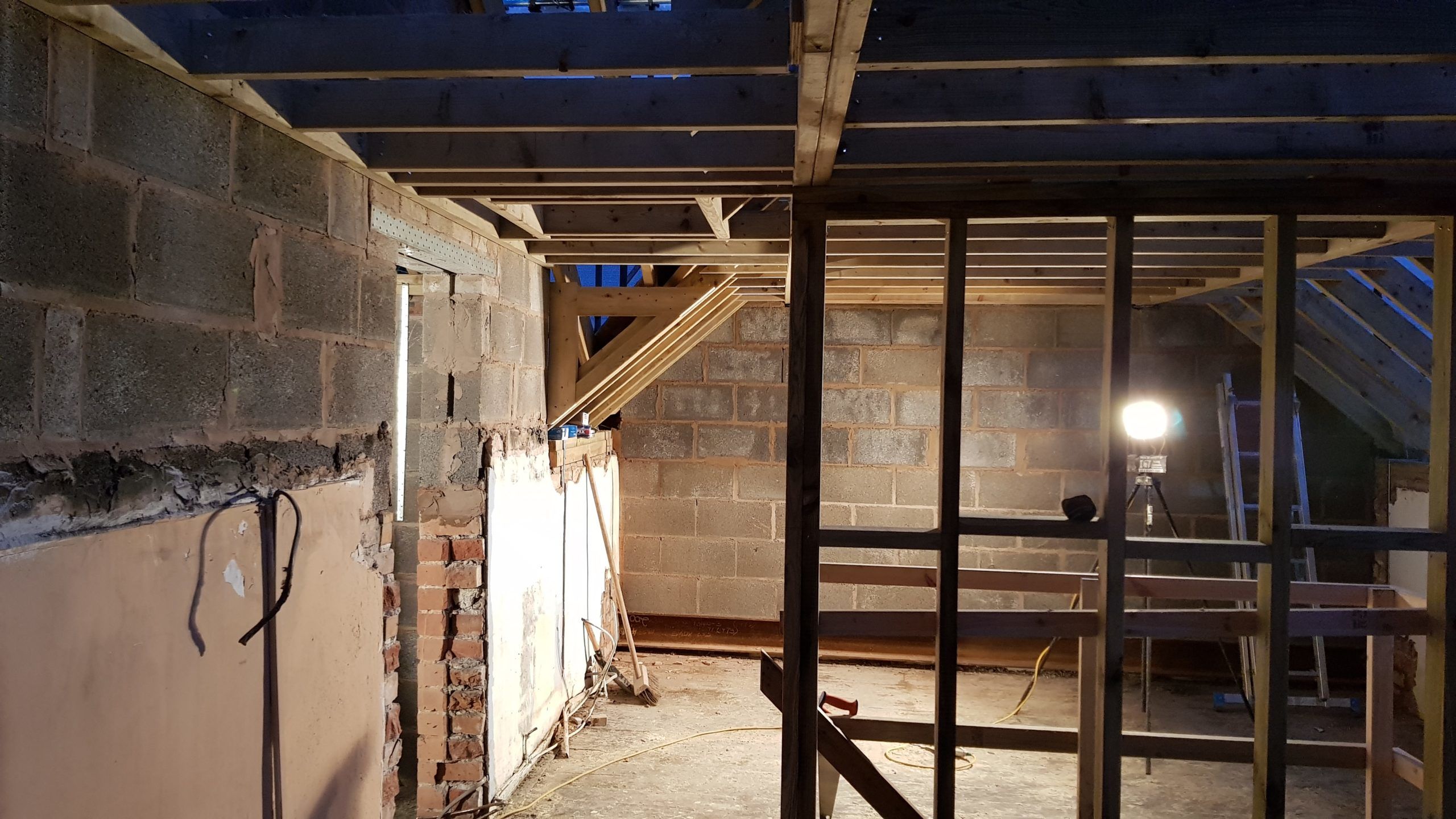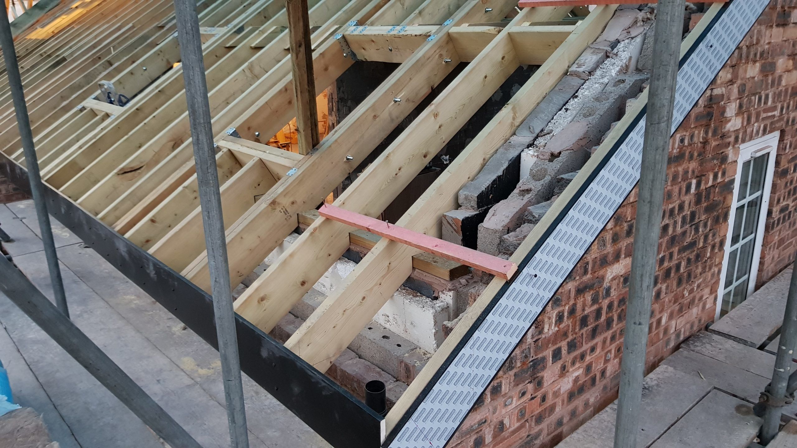 Work is moving at a pace now. The roof structure is pretty much complete, with soffets, barge boards, vents all in place. There is even some felt! Plaster has been stripped from the bedrooms in the old section of the house. Gable walls have been rebuilt. Next is getting the veluxs fitted so the rest of the roof can be felted and then it will be on with the slate!