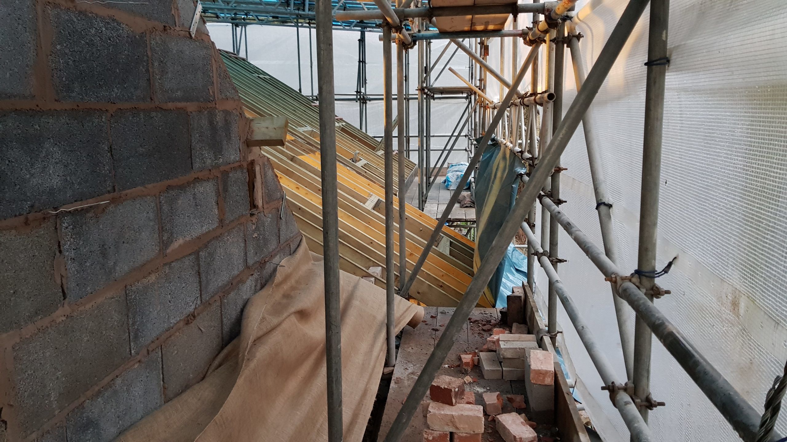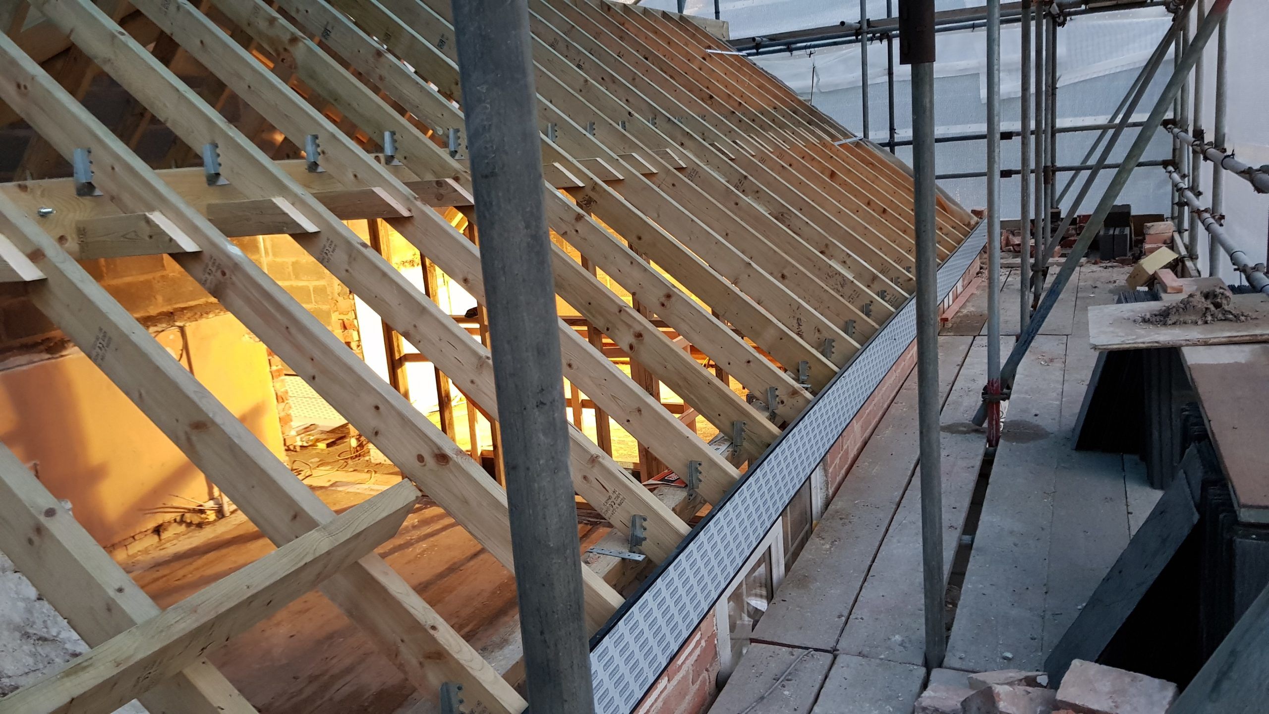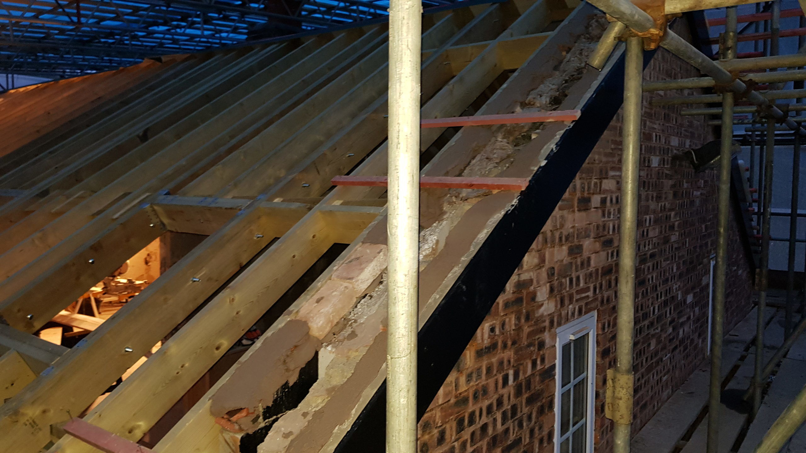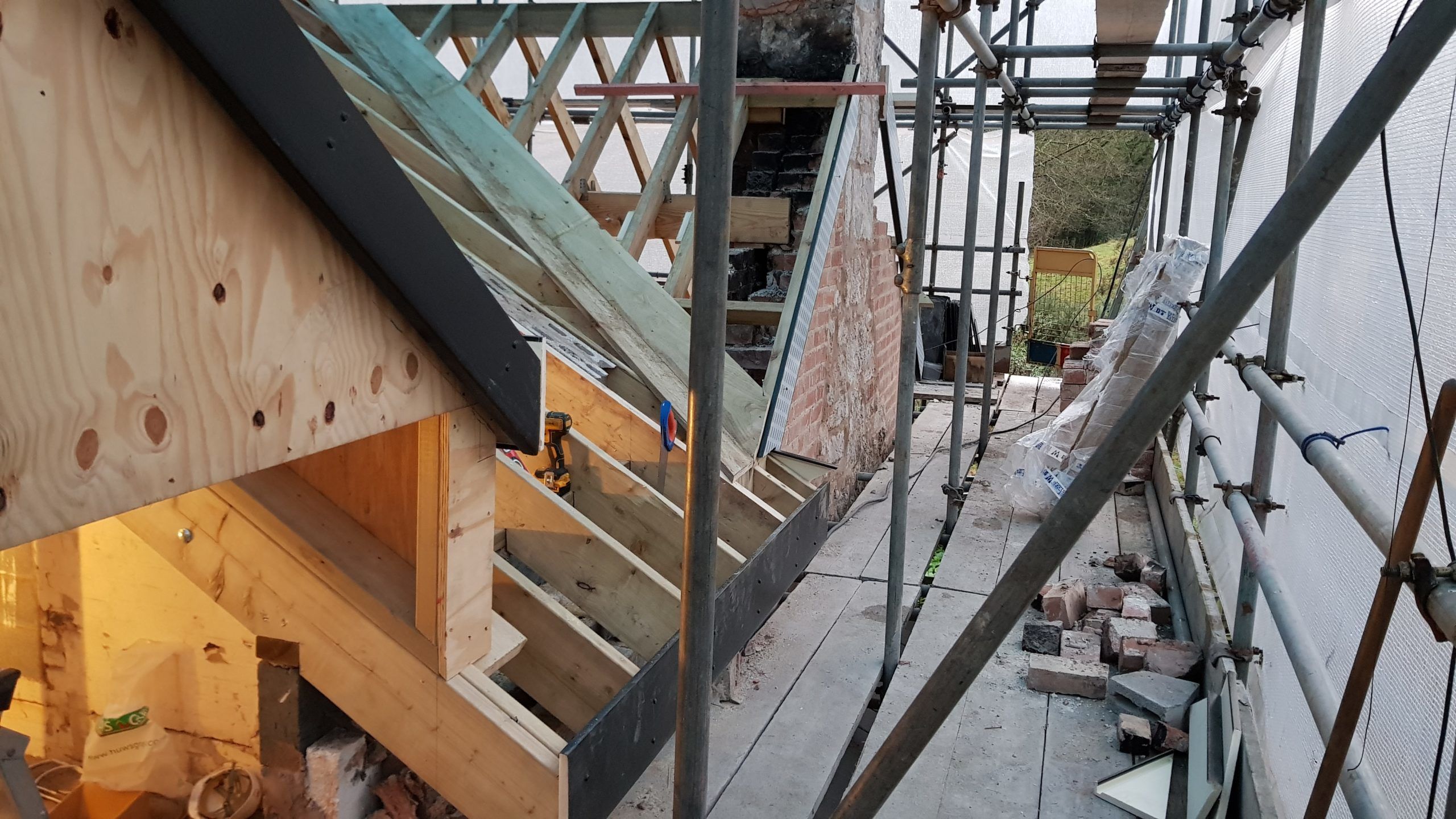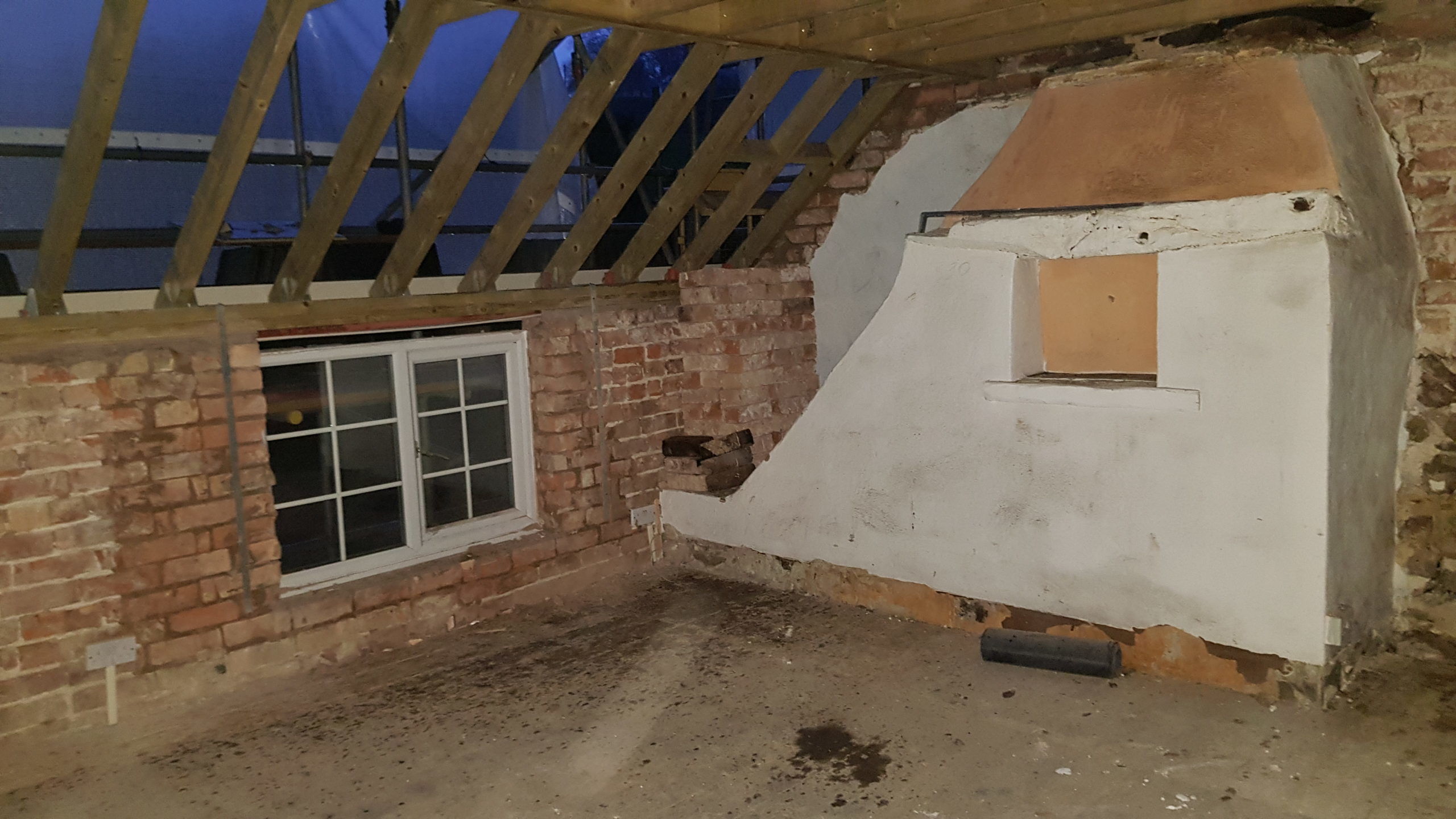 Work is moving at a pace now. The roof structure is pretty much complete, with soffets, barge boards, vents all in place. There is even some felt! Plaster has been stripped from the bedrooms in the old section of the house. Gable walls have been rebuilt. Next is getting the veluxs fitted so the rest of the roof can be felted and then it will be on with the slate!