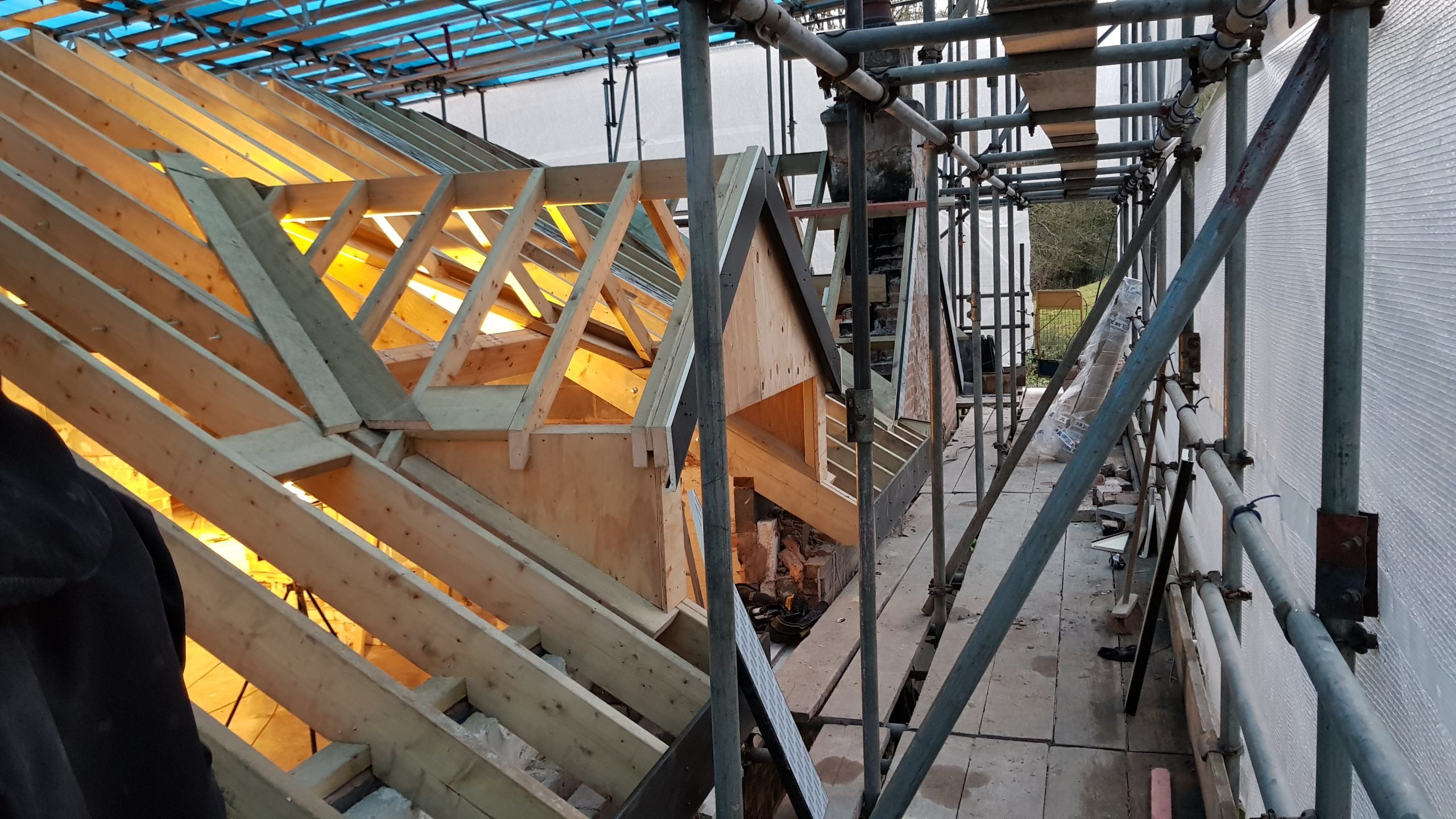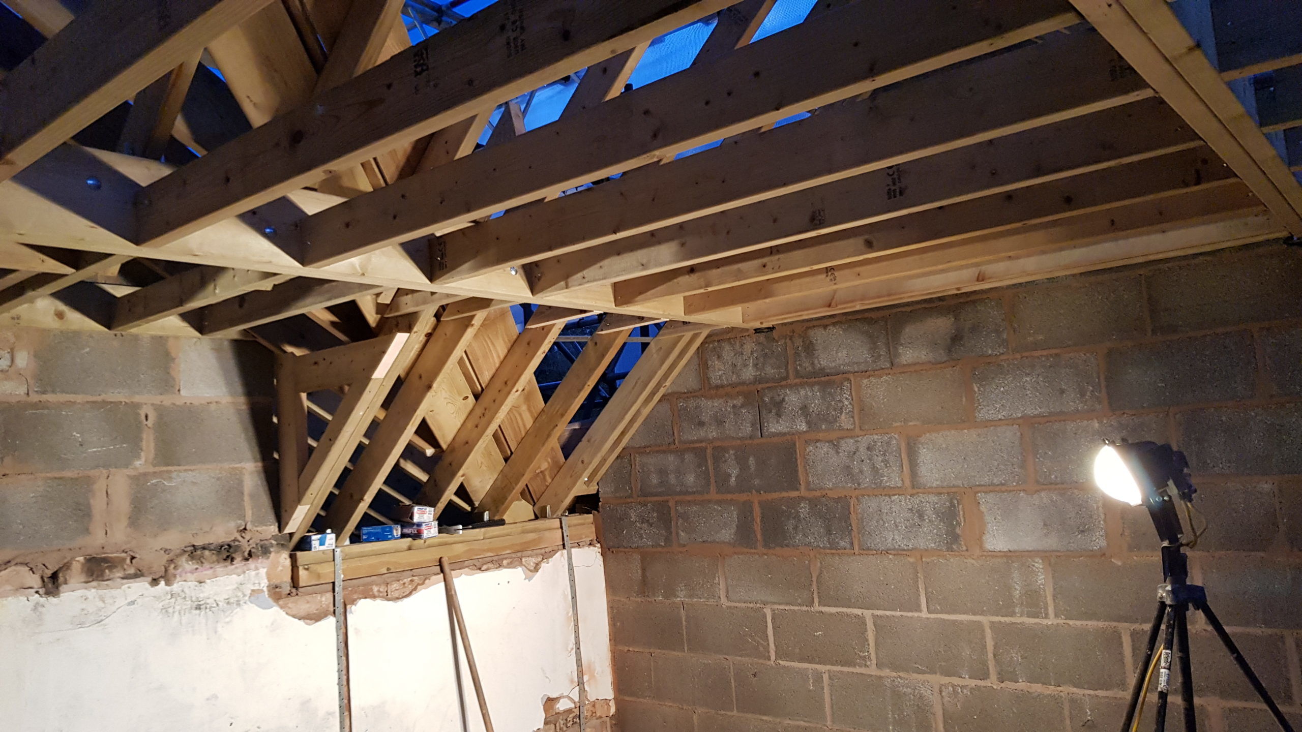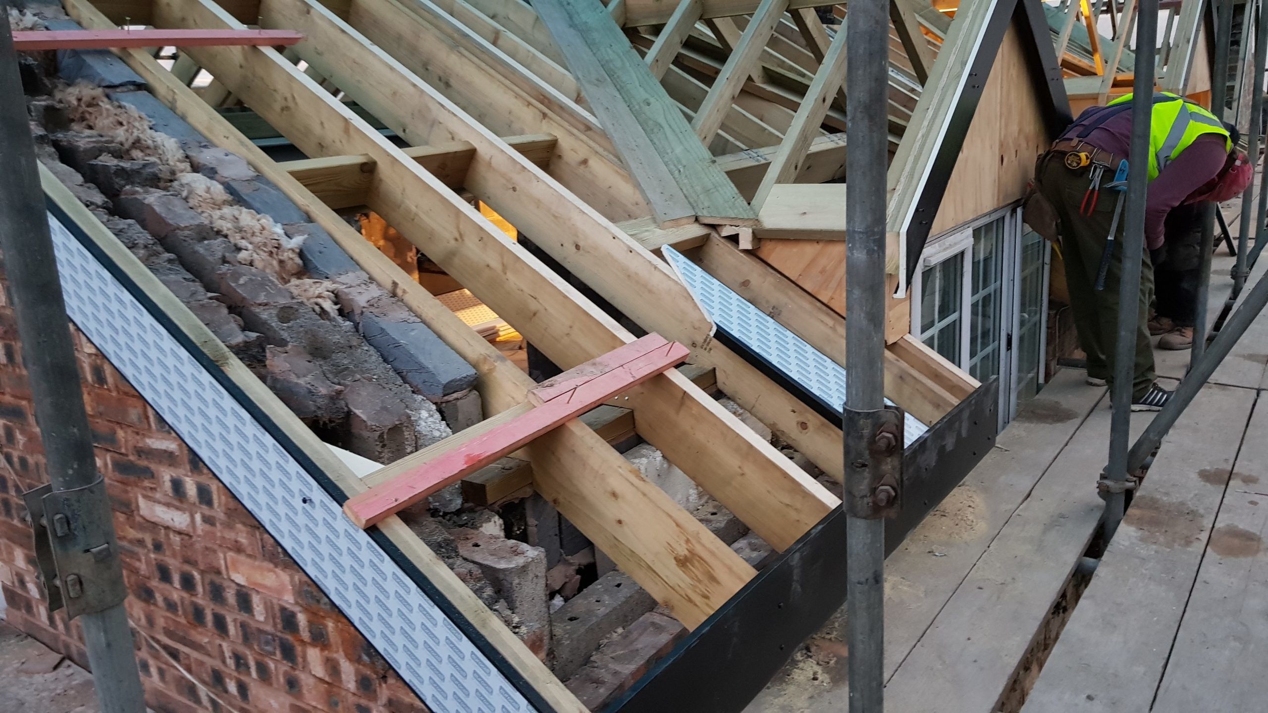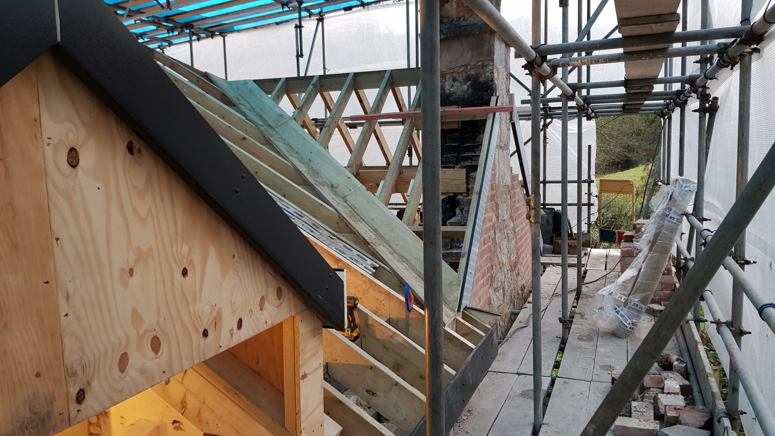 Work is moving at a pace now. The roof structure is pretty much complete, with soffets, barge boards, vents all in place. There is even some felt! Plaster has been stripped from the bedrooms in the old section of the house. Gable walls have been rebuilt. Next is getting the veluxs fitted so the rest of the roof can be felted and then it will be on with the slate!