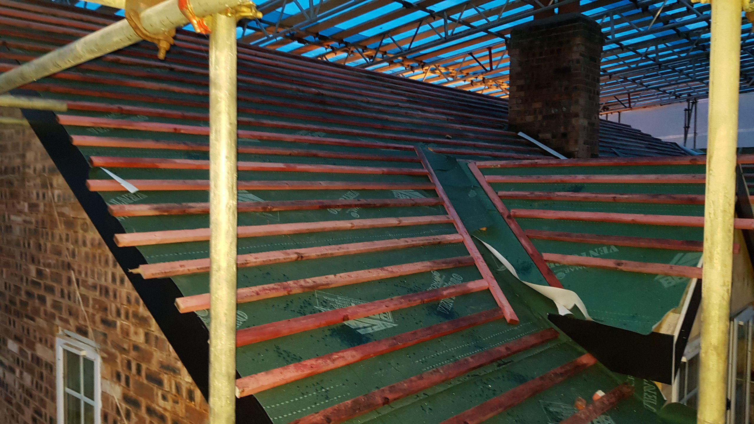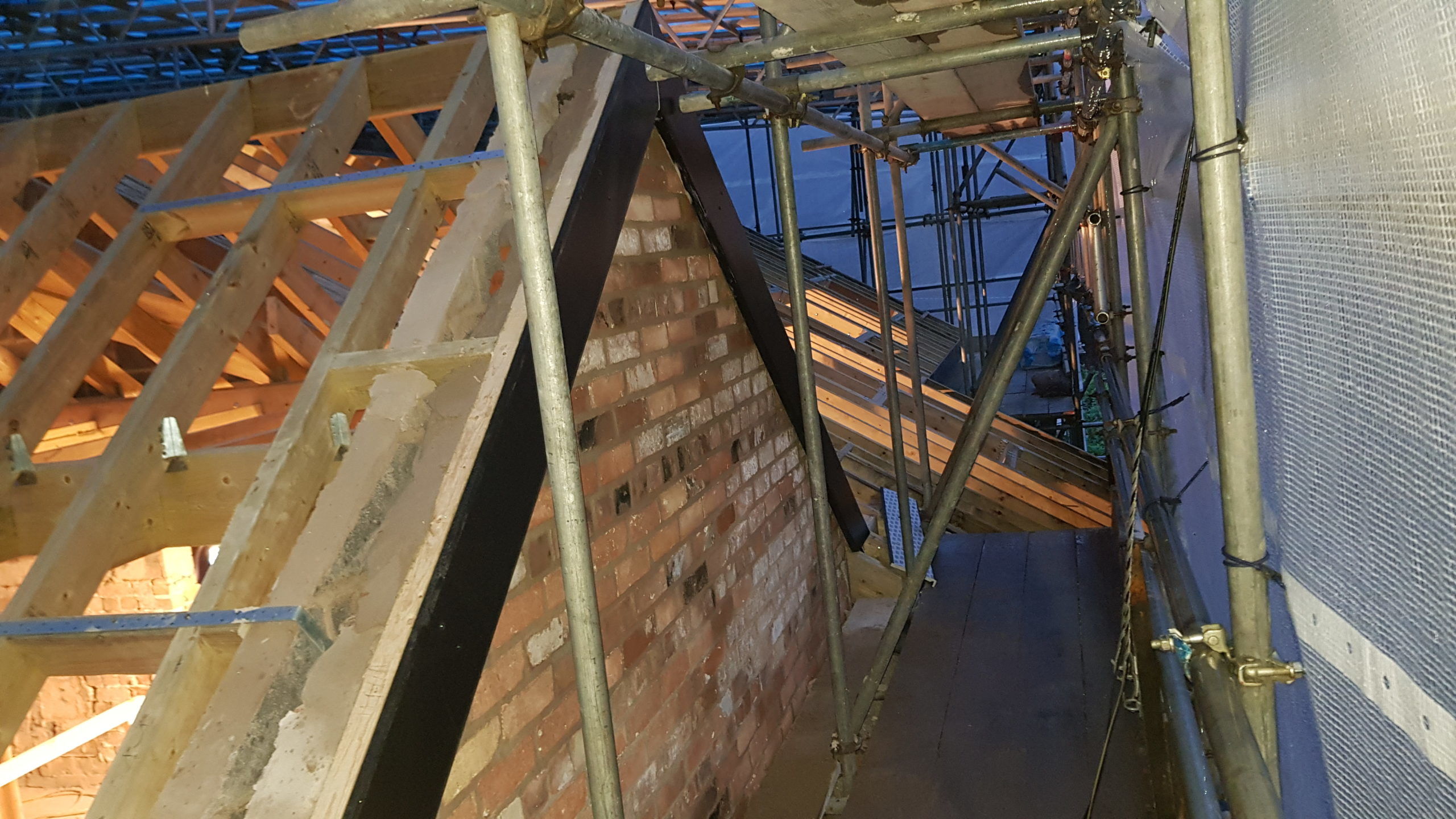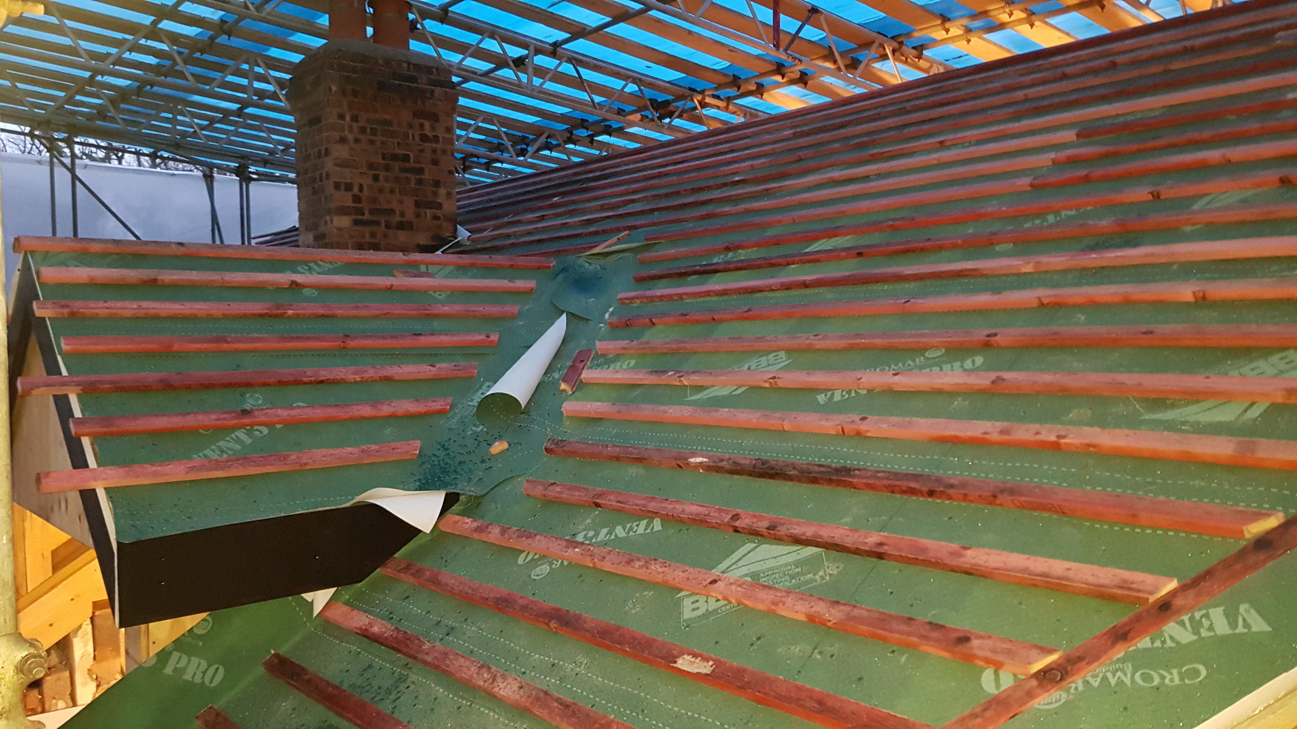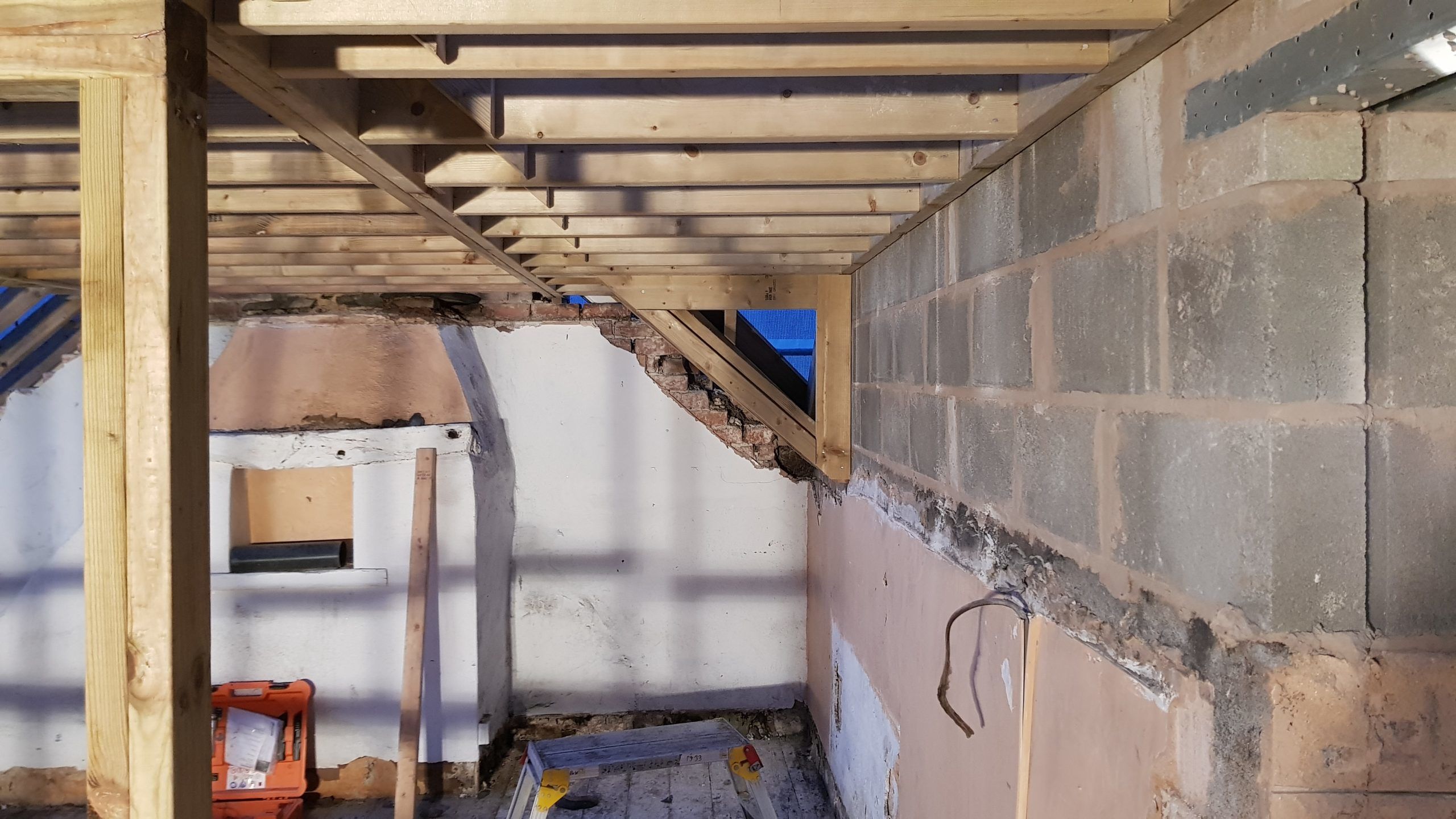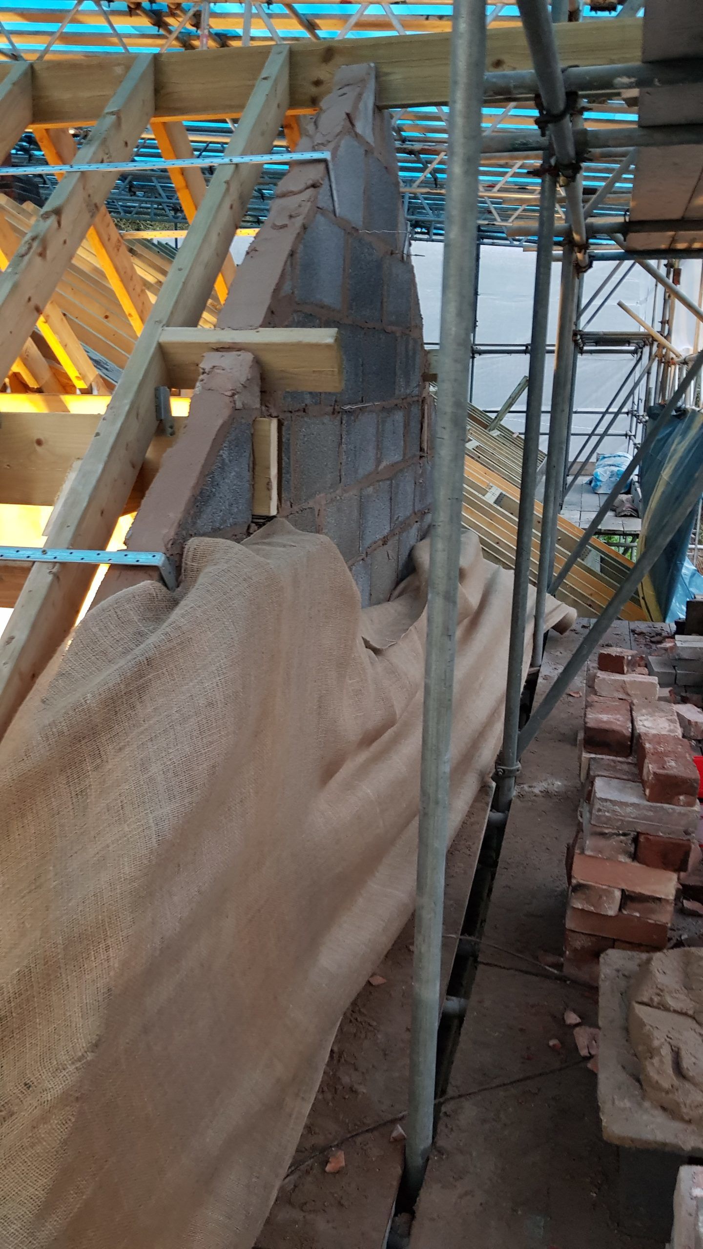Work is moving at a pace now. The roof structure is pretty much complete, with soffets, barge boards, vents all in place. There is even some felt! Plaster has been stripped from the bedrooms in the old section of the house. Gable walls have been rebuilt. Next is getting the veluxs fitted so the rest of the roof can be felted and then it will be on with the slate!